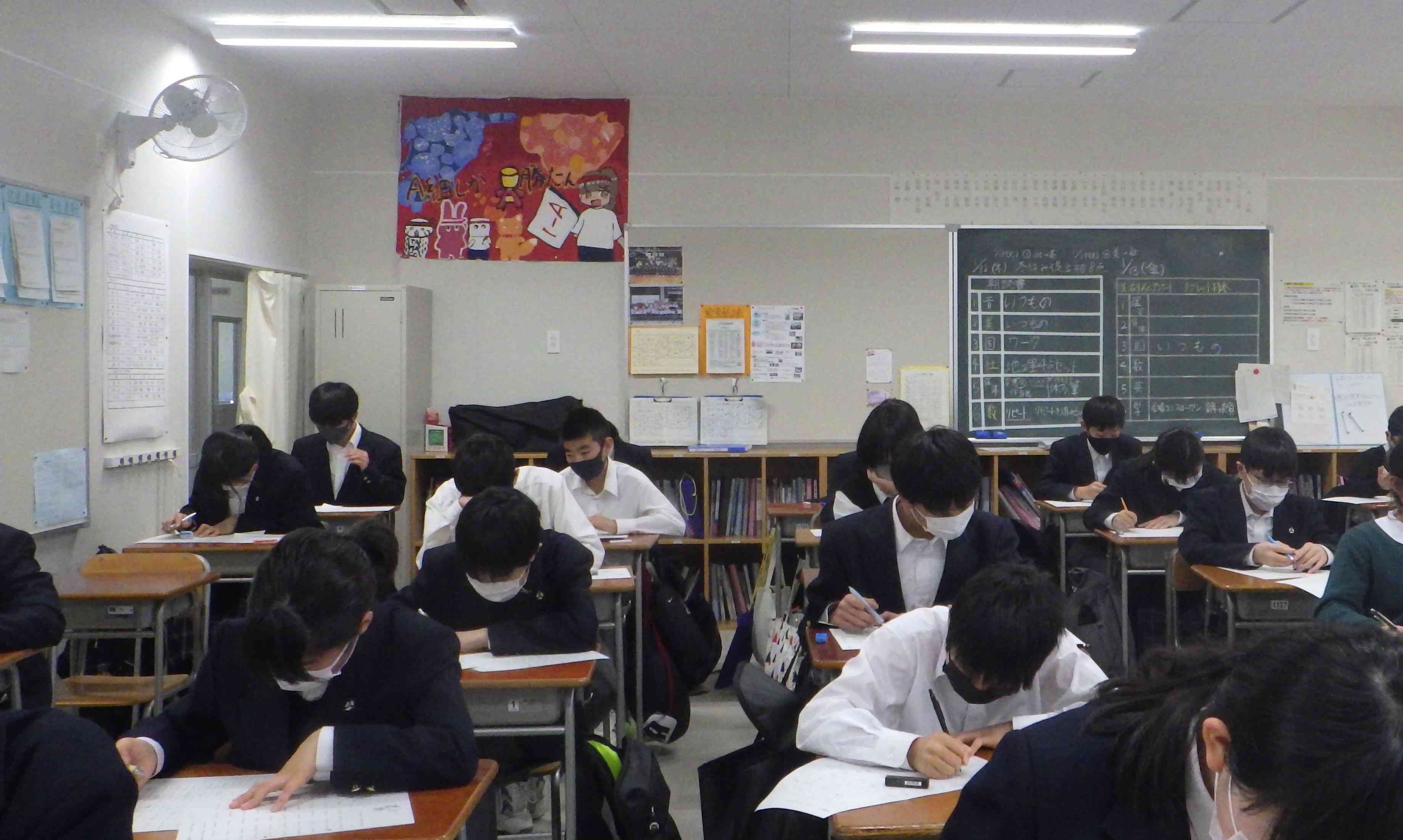 各教科、冬休みのまとめテストが行われています。 国語科では、1・2年生対象に漢字書き取りテストを実施しました。 赤シートで隠しながら何度も漢字を練習している生徒たち…。 努力が点数に結びついたのではないでしょうか。 3学期も引き続き、頑張っていきましょう☆