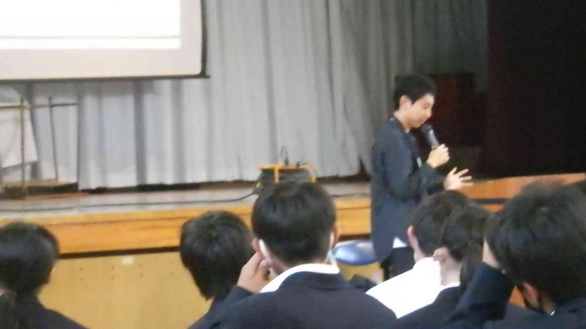 1学年の総合的な学習の時間が体育館にて行なわれました。 卒業後にどんな自分でいたいか、などの話がありました。失敗しても人生の失敗にはならない。と自分の経験談を交えながら話をしてくれました。 今後の学校生活に生かしていけるといいですね。
