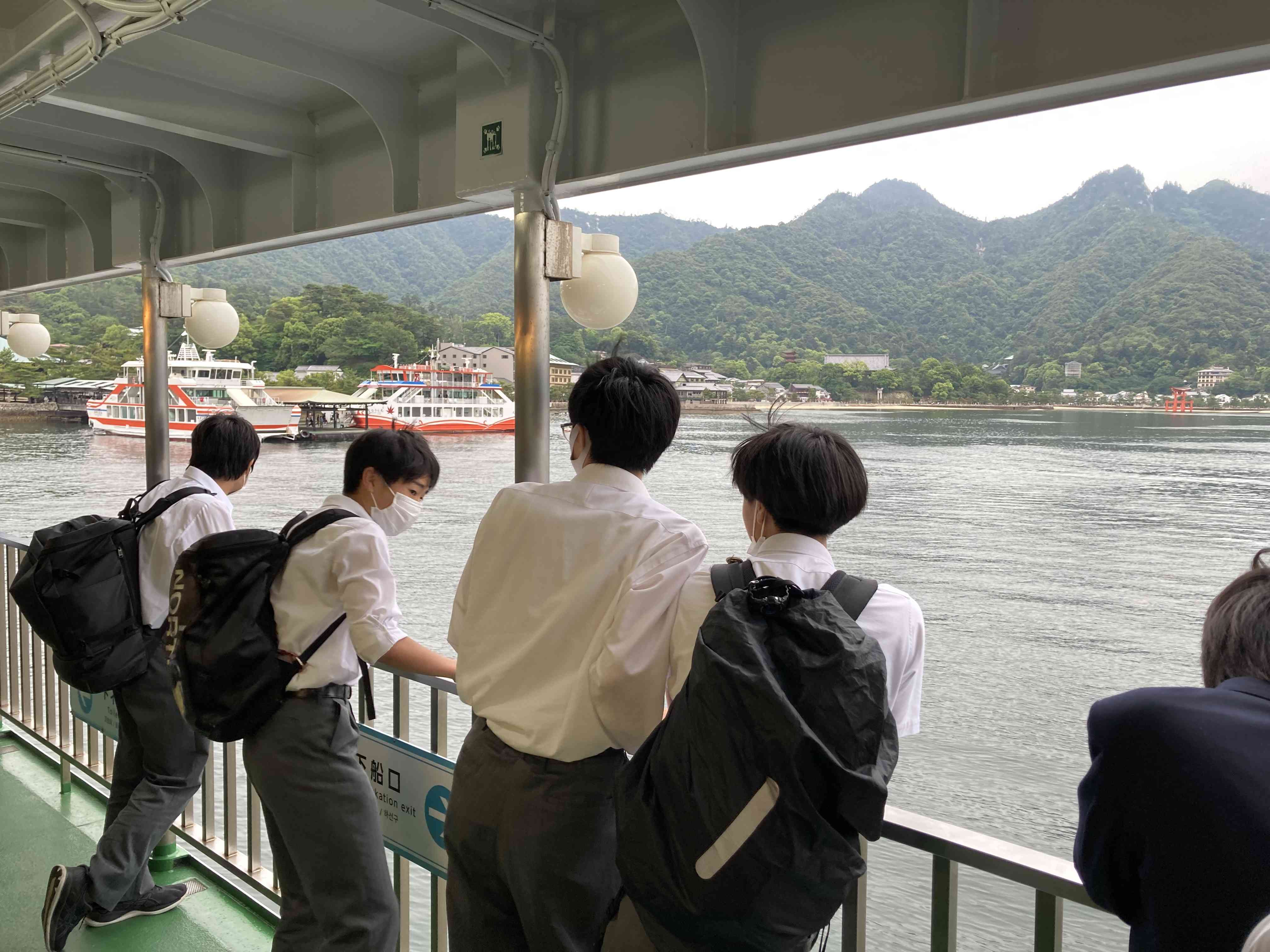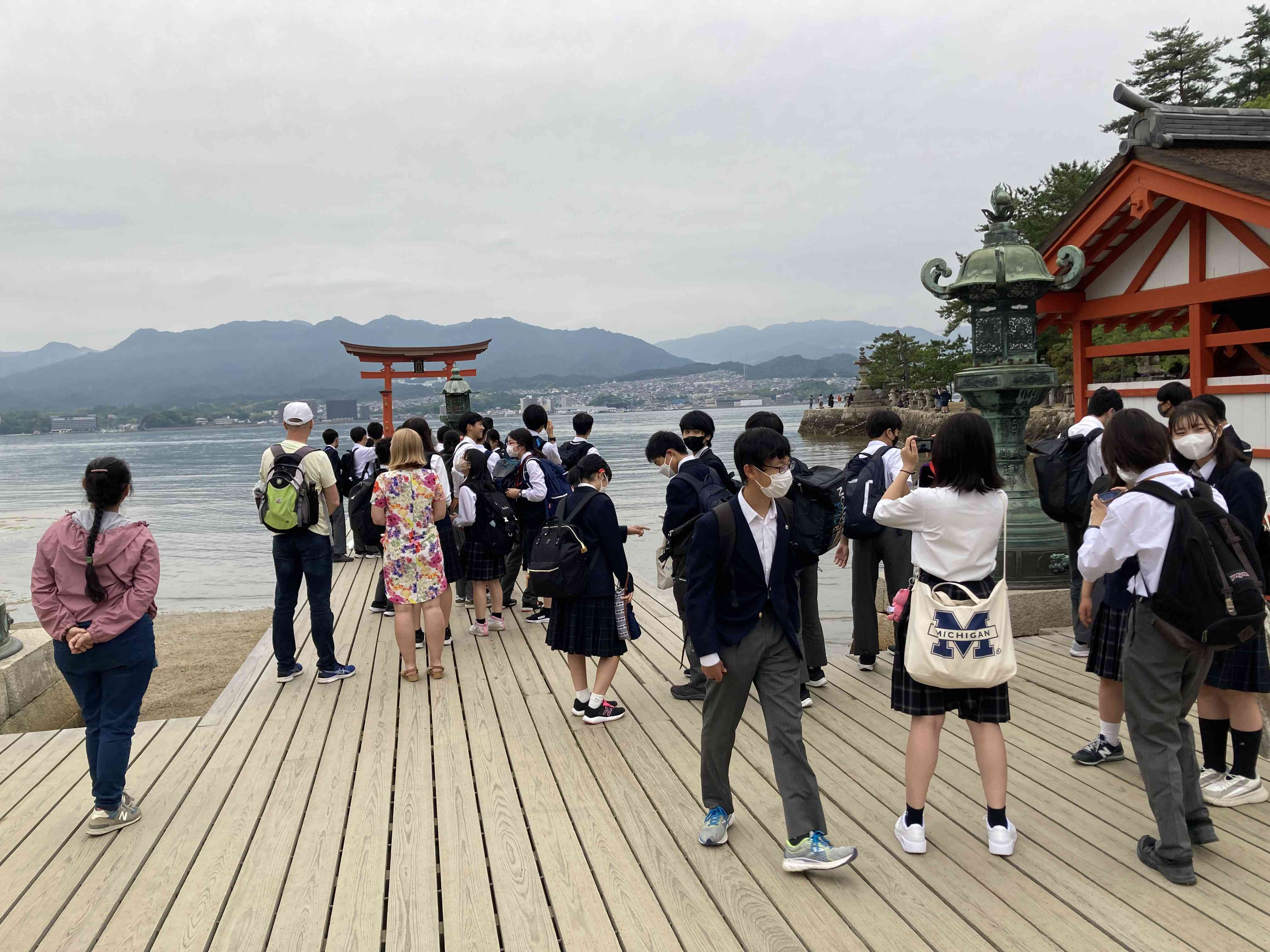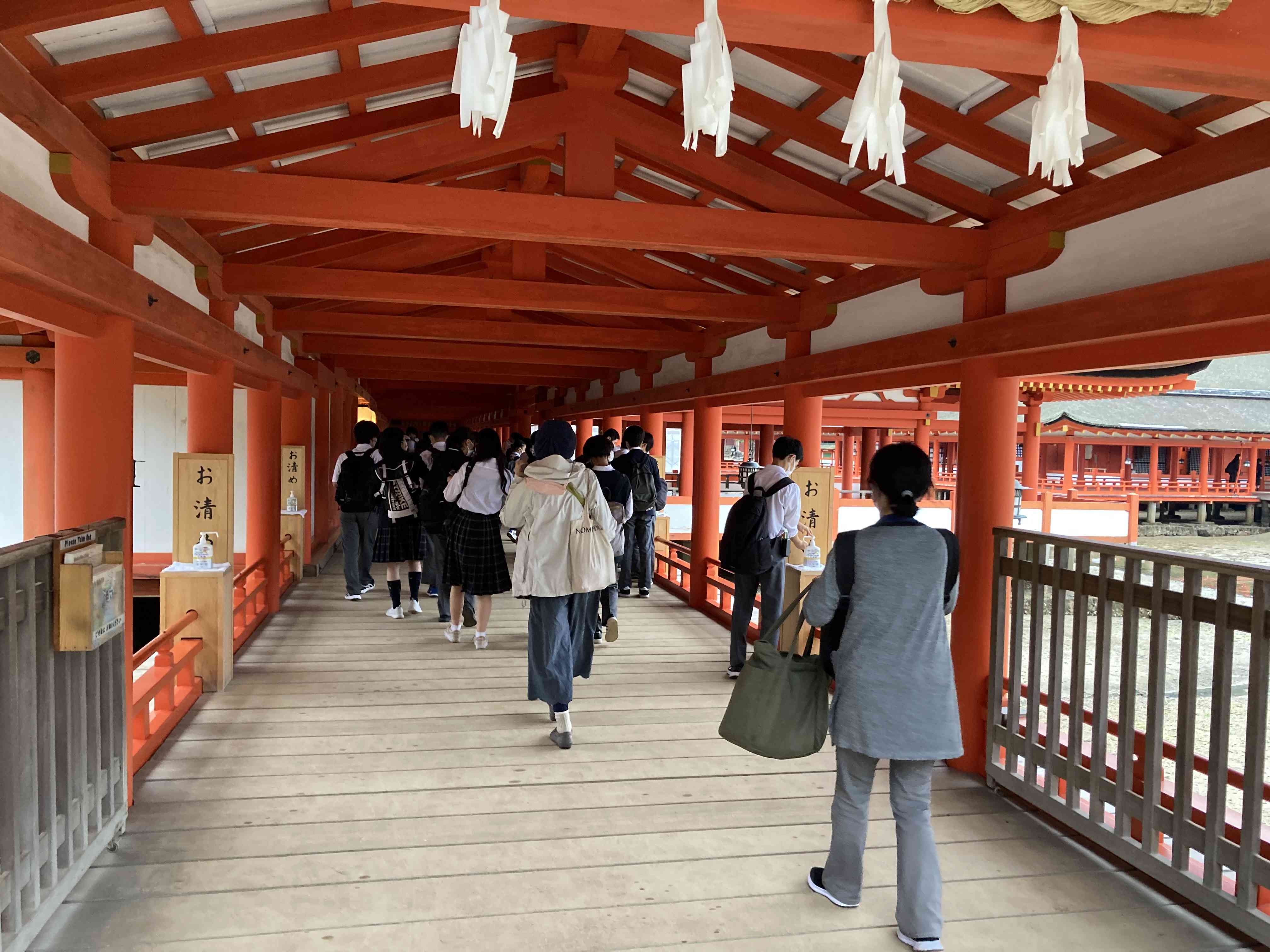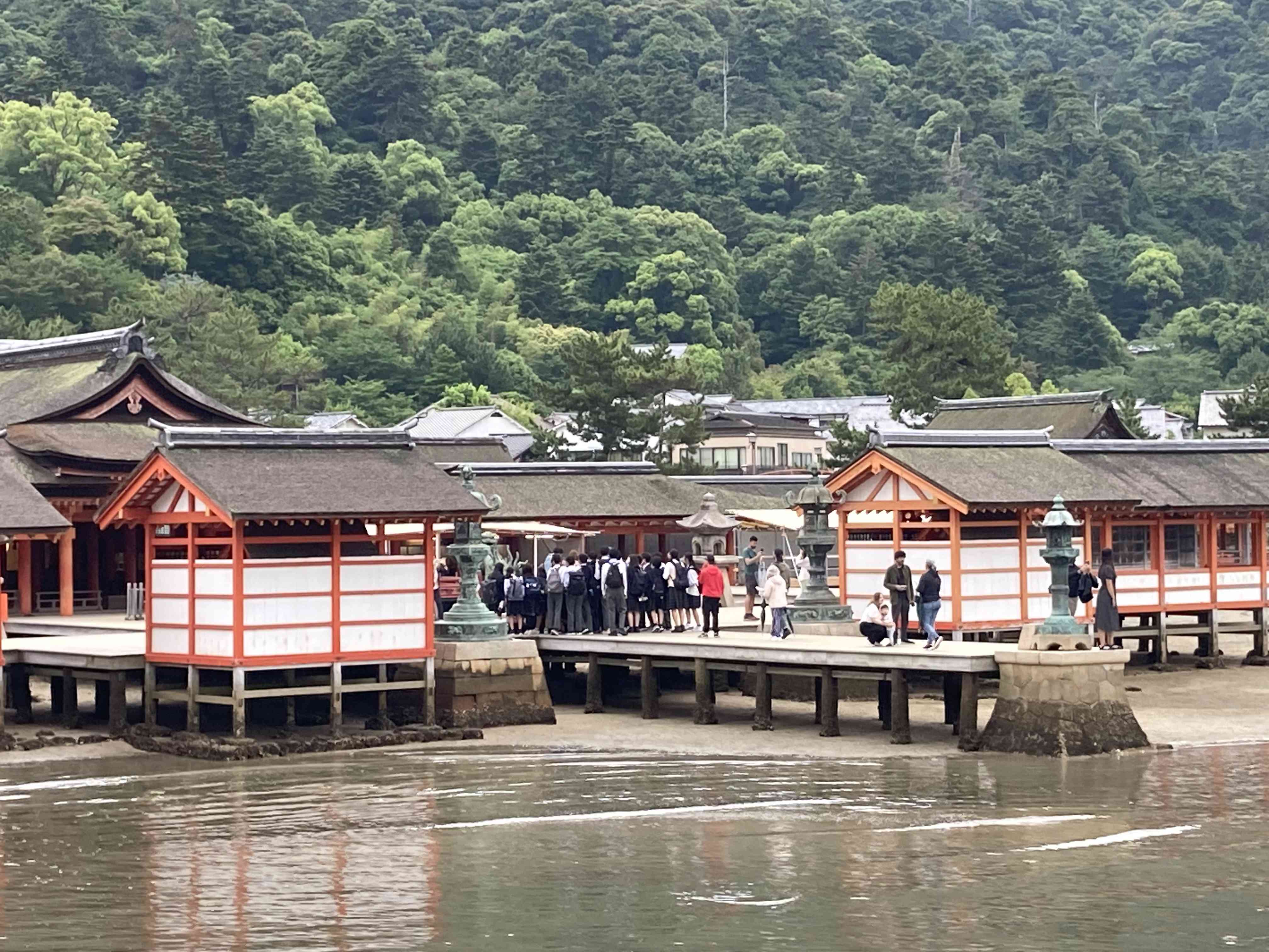 フェリーに乗って宮島に到着。厳島神社を訪れました。小雨程度で済んでます。