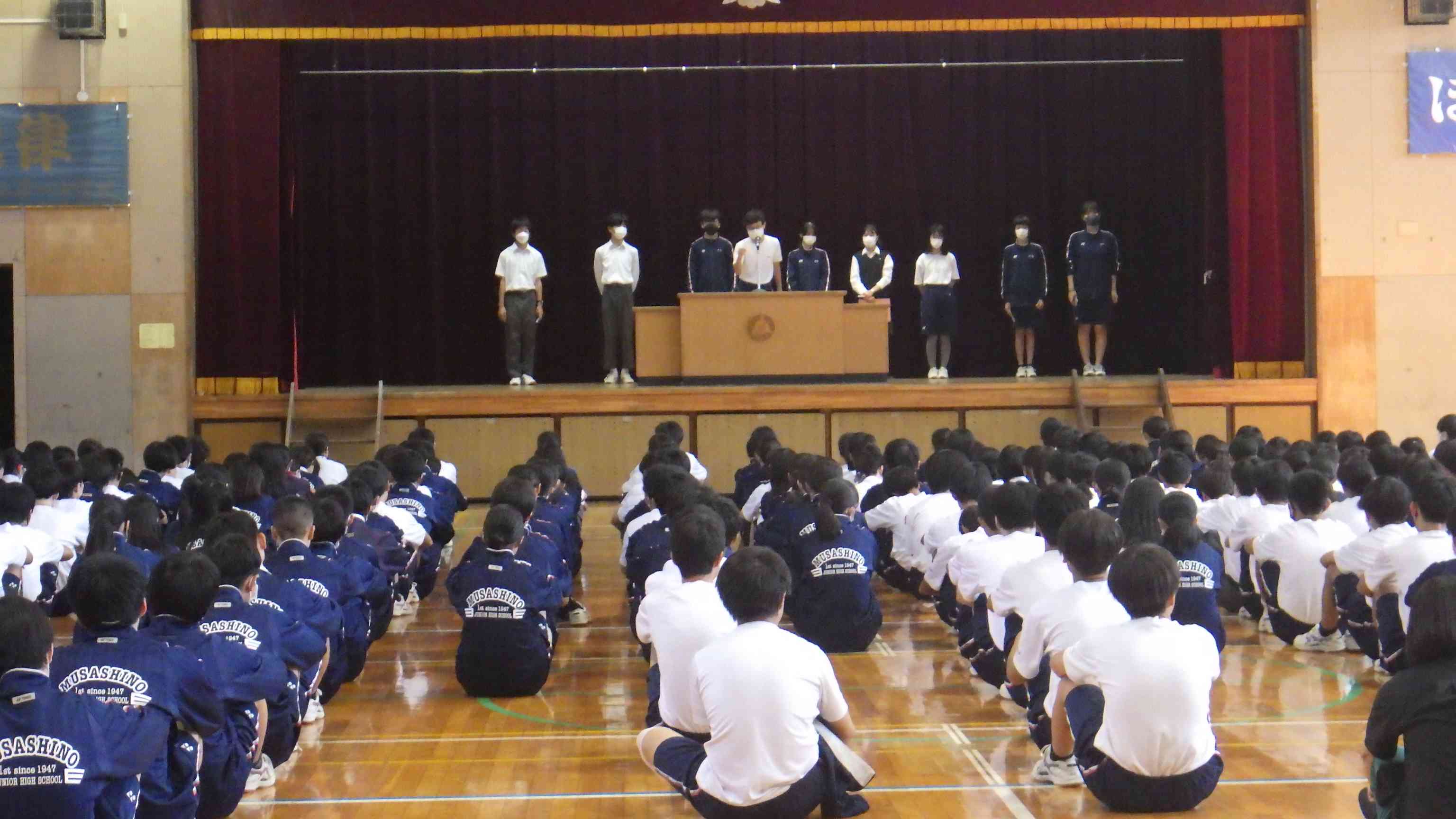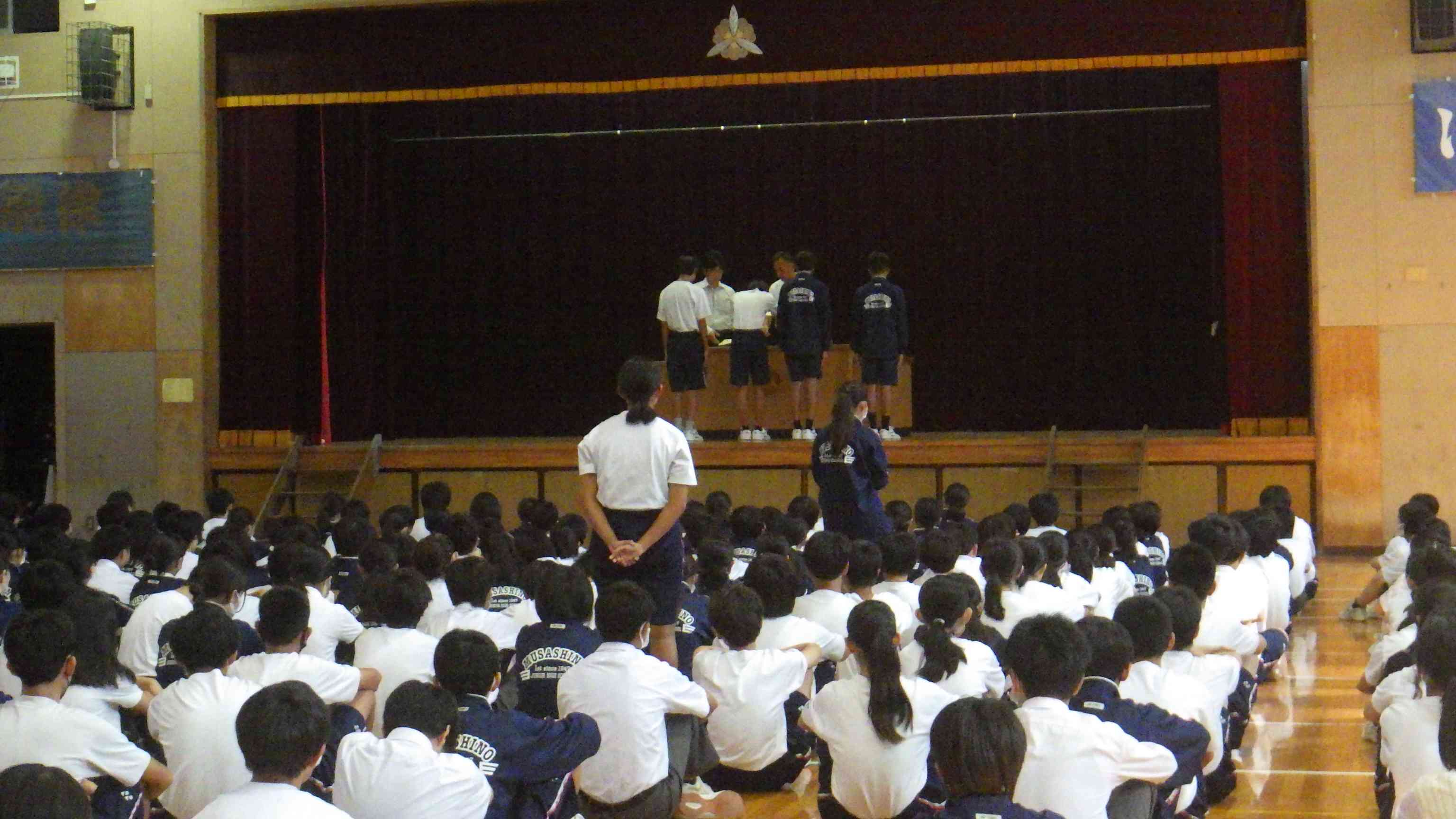 本日の生徒会朝礼では、任期満了まで残り一か月となった前期委員会より報告がありました。 美化委員会からもありましたが、もう一度教室をきれいにしてみましょう。ちいさなごみを捨てるところから始められると良いですね。 部活の表彰もありました。好成績をおさめることができたようです。夏休み中にも多くの部活動が活躍していましたね。