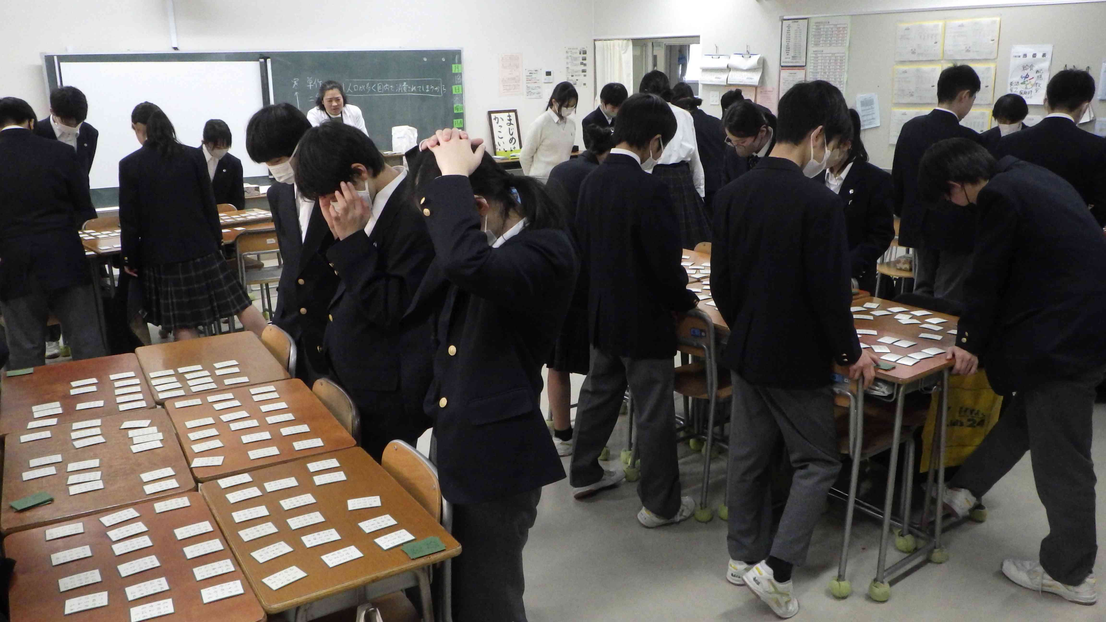 本日の6校時、第1学年では各クラスで百人一首を行いました。 読みなれない古文に苦戦しながらも懸命に読む先生。 それを聞き漏らすまいと必死に聞き、札を取る生徒。 全員が読み上げの声をしっかり聞けるよう、 先生が読み始める前はもちろん、読み終えるまで静けさを保って騒ぎすぎず、かつしっかりと盛り上がる様子が素敵でした。 後日に予定されている学年単位での百人一首大会でも、もれなく全員が楽しめる時間になることを期待しています!【添付ファイル】
