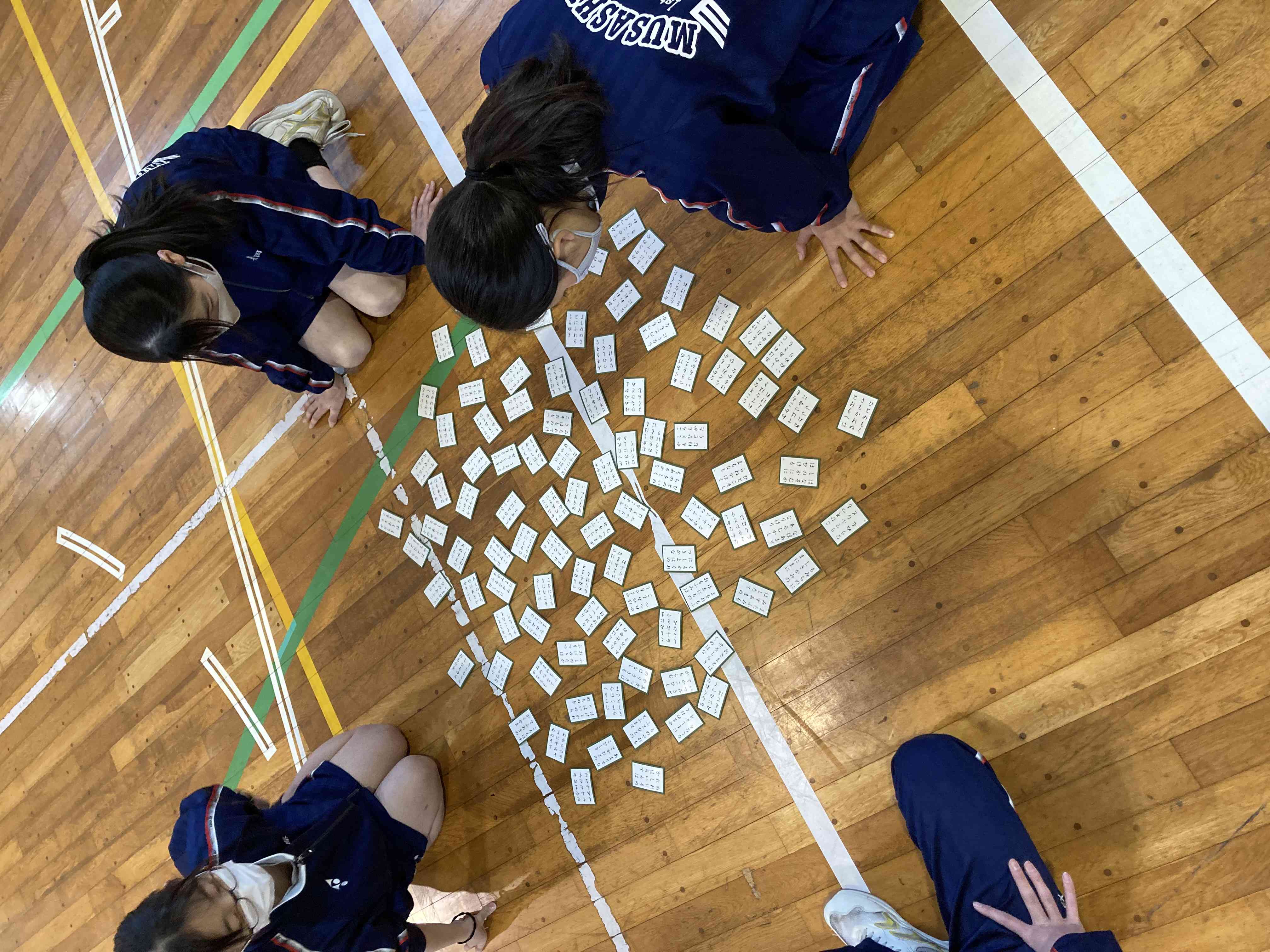 6校時に1年生は、体育館で百人一首大会を開催しました。各クラス内の順位ごとに他のクラスの人と4人組になります。先生たちが歌を詠み、クラス対抗での勝負です。